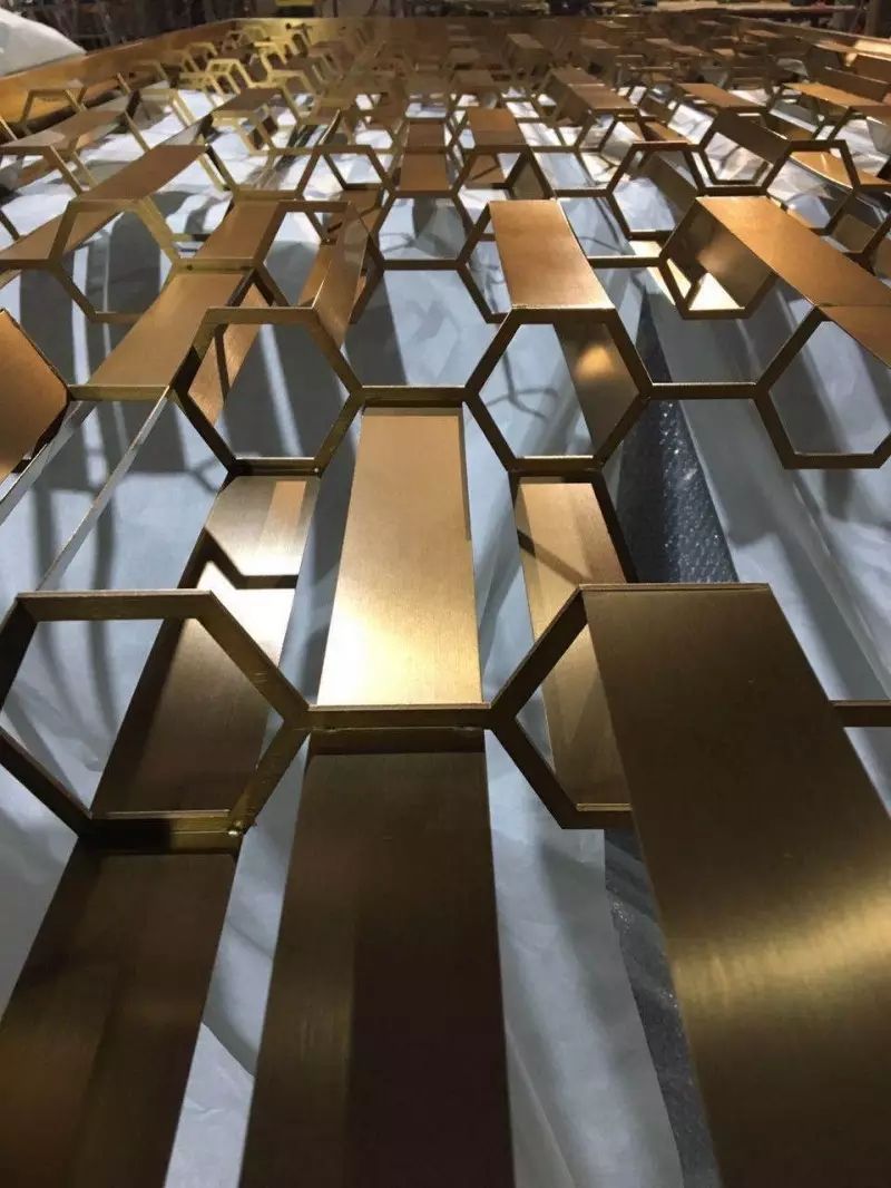 二、表面着色处理:不锈钢屏风的表面着色处理主要是通过“镀色封釉”来达到上色的效果,镀色有电镀、水镀、氟碳漆、喷漆等处理方式,根据不同的效果使用不同的镀色方式。而“封釉”就是指无指纹处理,通过油状液体使得表面上色十分平滑、亮光。