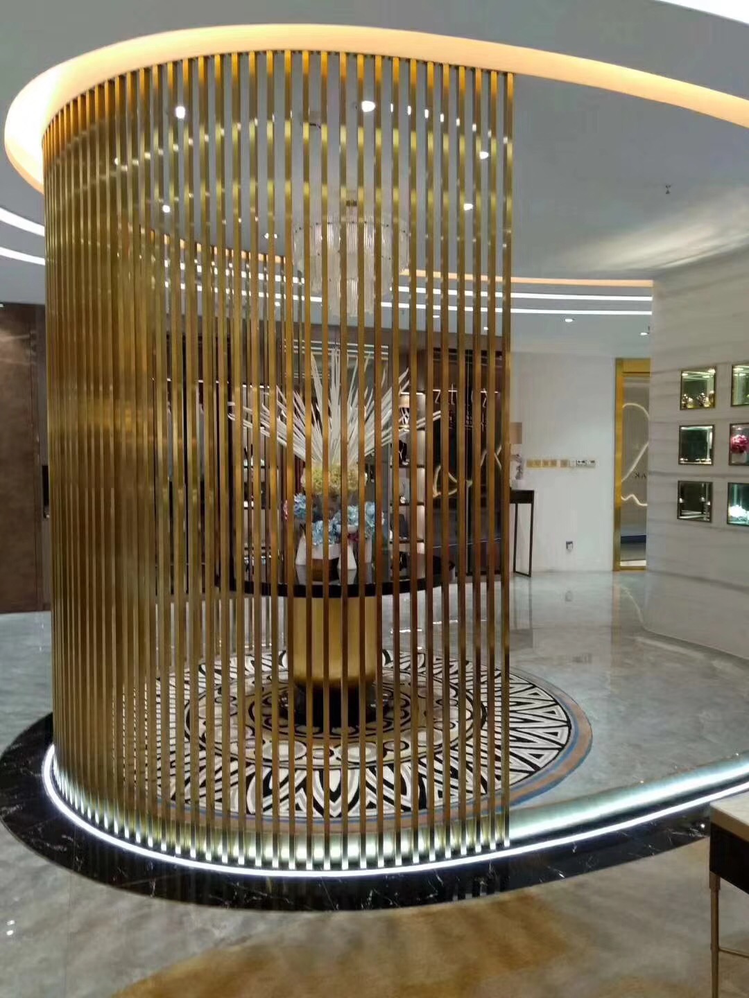 钛金不锈钢隔断的造工,根据要求的花纹图案不同,制作的难度也会不相同,当然有些不锈钢屏风,直接采用不锈钢板进行激光切割、然后通过板材折弯达到想要的效果,不同的形状大小的不锈钢条焊接在一起,就可以完成不锈钢隔断中间部分的制作啦,然后,再焊接在制作好的不锈钢框架上,送去电镀加工,镀上一层钛金色就完成啦.