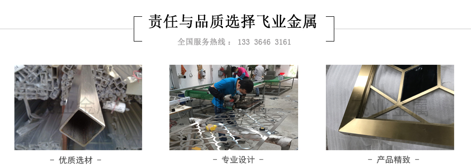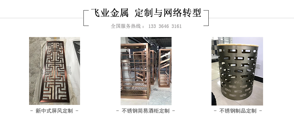 佛山市飞业金属制品有限公司是一家拥有8年专业生产不锈钢屏风、不锈钢花格、不锈钢玻璃隔断、不锈钢酒柜酒架定制等不锈钢装饰制品的生产厂家,产品广泛应用于酒店、售楼中心、餐厅等不锈钢装饰工程定制,是一家集设计、生产、销售于一体的现代化公司。